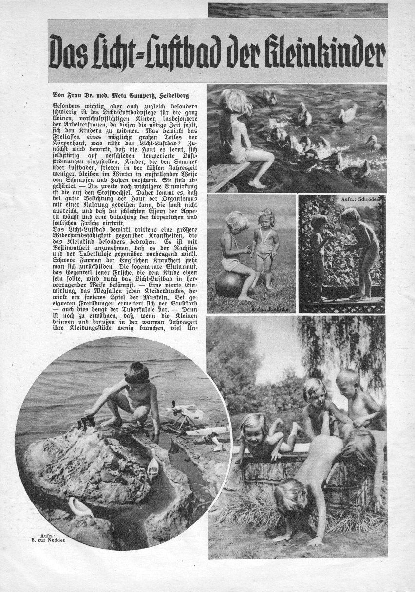 Dieses Monatsmagazin der Reformhäuser berichtete mit zahlreichen Bildern im August 1934 über »Das Licht-Luftbad der Kleinkinder«. Im wesentlichen geht es in diesem Artikel darum, wie wichtig die Sonneneinwirkung gerade bei Kindern ist - nicht nur für die Gesundheit selbst, sondern auch zur Abhärtung. Der Nutzen der Kleiderersparnis, also der Nacktheit, wird ganz besonders hervorgehoben. |