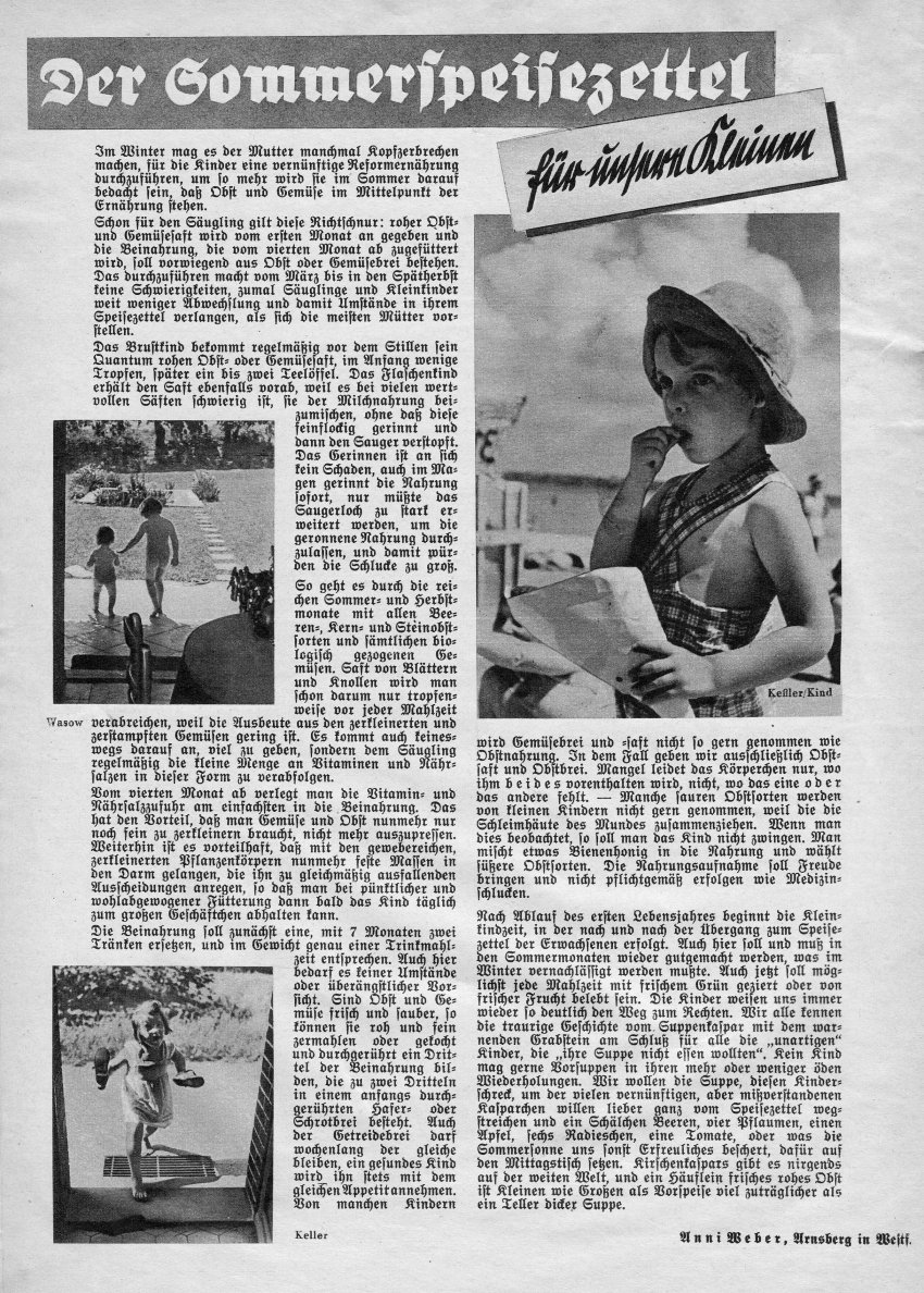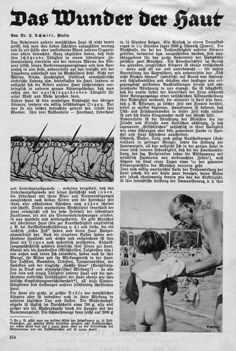 „Das Wunder der Haut” war das Hauptthema dieser Ausgabe des Reformhaus-Heftes. Erklärt wird der Aufbau der Haut und ihre Funktion als Schutz und natürlich die Pflege der Haut mit Produkten aus dem Reformhaus. Es wird erwähnt, dass es gerade für Kinder sehr gesund ist, wenn es das Wetter erlaubt, immer möglichst nackt zu sein, um so Luft und Sonne an den ganzen Körper gelangen zu lassen. In dem zweiseitigen Artikel „Kein Kindlein braucht mehr wund zu sein” (Doppelseite) werden nicht nur die entsprechenden Wundschutzmittel (Öle und Pulver) vorgestellt, es wird auch darauf hingewiesen, die Kinder möglichst oft „nackig” herum laufen zu lassen, um halt so Wundstellen vorzu- beugen, denn, wo keine Windel oder unbequeme Kleidung scheuert, da kann das Kind auch nicht wund werden. |