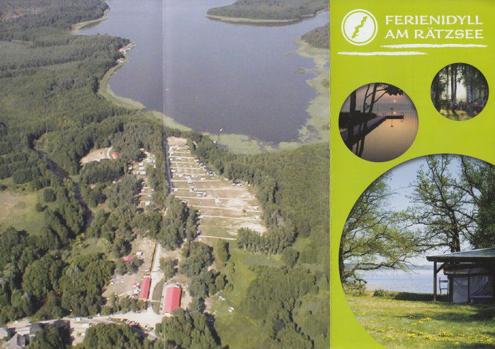 Werbeprospekt für das Ferienidyll am Rätzsee, einem FKK-Campingplatz inmitten der Mecklenburgischen Seenplatte. Mit Bildern von dem Campingplatz und einer Luftbildaufnahme. Weitere Information unter: www.ferienidyll-am-raetzsee.de