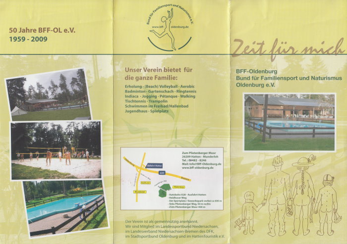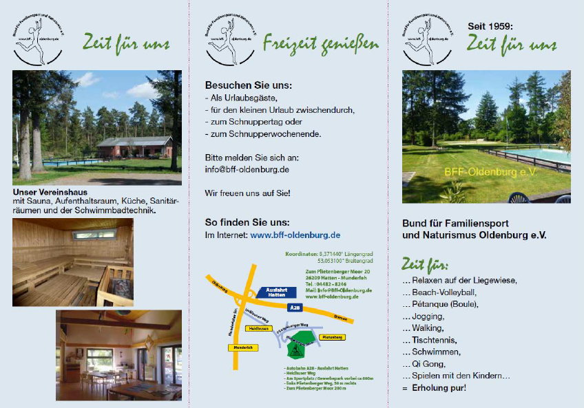 Prospekt für den Bund für Familiensport und Naturismus Oldenburg e.V., BFF-Oldenburg. Mit Bildern aus dem Vereinsleben, Auflistung der Aktivitäten und einer Anfahrtskizze. Weitere Information unter: www.bff-oldenburg.de