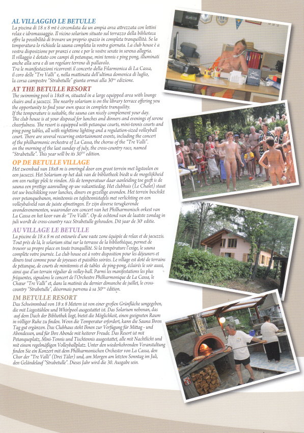 Die Naturistenanlage, nicht weit von Turin (→ 25 Km) entfernt, grenzt an den Mandria-Park, in der Nähe des Königspalast von Venaria. Der 8-seitige Faltprospekt (DIN A4) zeigt die Unterbringungsmöglichkeiten (→ Bungalows/Campingplatz), Freizeitaktivitäten und Anfahrtsskizze.
