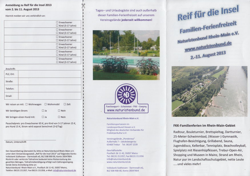 Reif für die Insel Mit diesem Prospekt wirbt der Naturistenbund Rhein-Main e.V. für FKK-Familienferien auf der „Ponderosa”, dem Vereinsgelände. Anschrift: Naturistenbund Rhein-Main e.V. Geschäftsstelle Postfach 26 11 42 55057 Mainz Internet: www.naturistenbund.de |