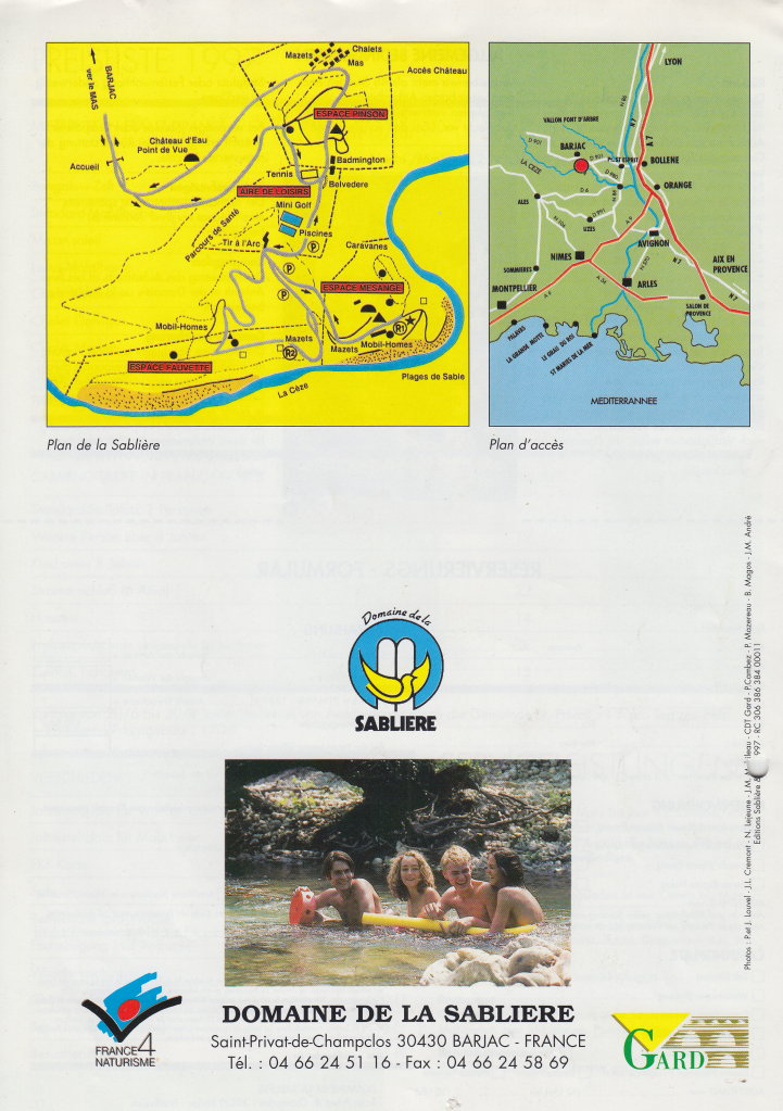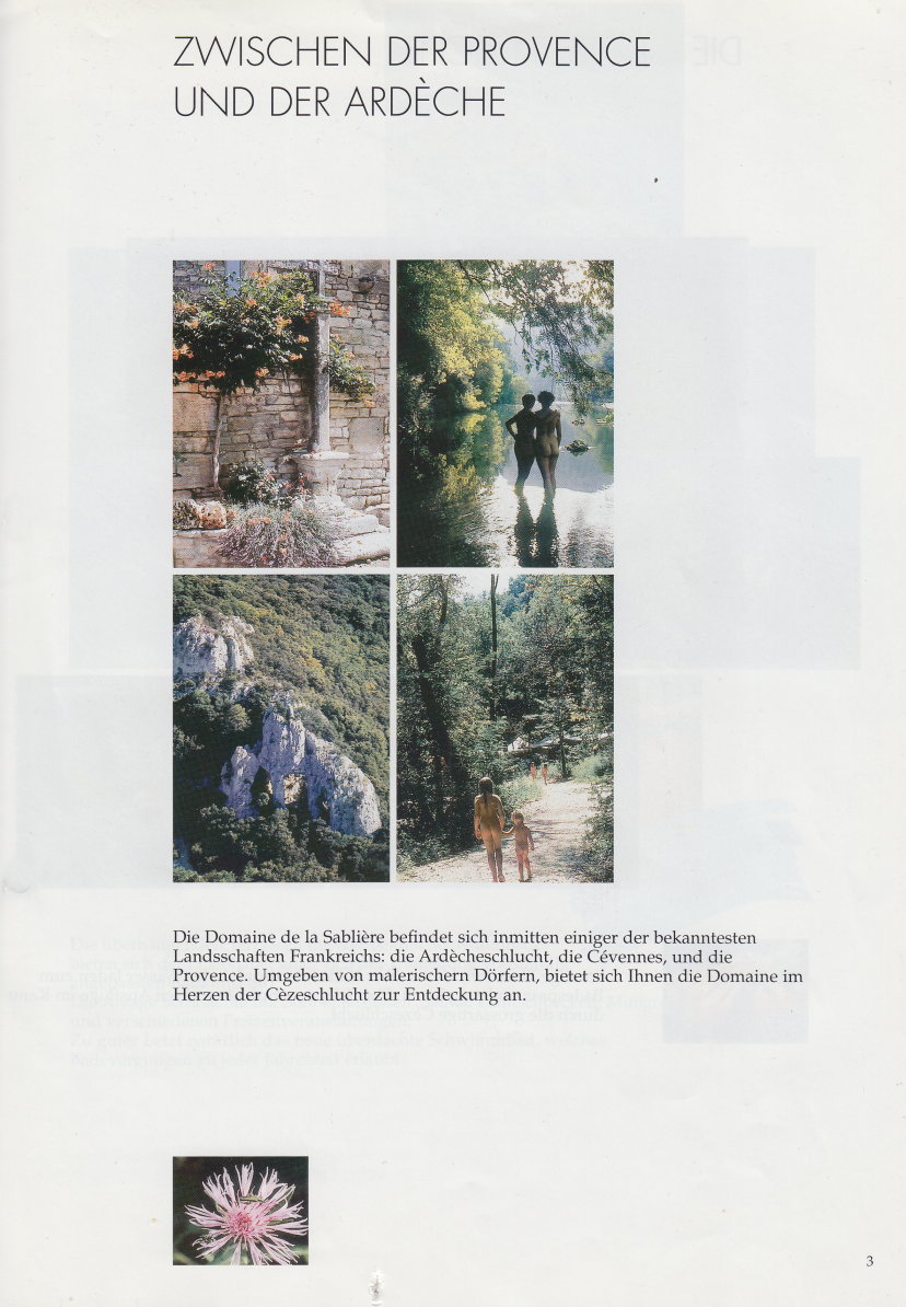 12-seitiger Prospekt zu einem beliebten französischen FKK-Reiseziel, die Domaine de la Sablière, zwischen der Provence unbd der Ardèche. Der Prospekt zeigt nicht nur die Anlagen und Freizeitangebote, sondern gibt auch einen kleinen Einblick in die umliegende Landschaft.