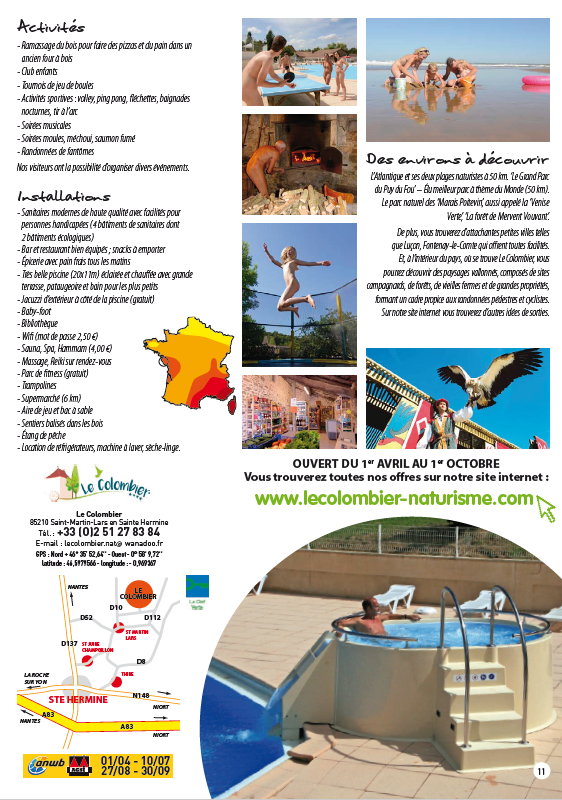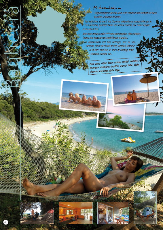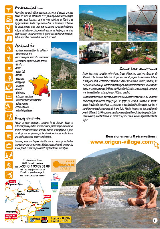 16-seitiger Prospekt im Format DIN-A5 (geheftet) zu den naturistischen Zielen Origan Village, Bagheera, Creuse Nature, Le Colombier, Domaine Laborde und Les Lauzons in Frankreich
