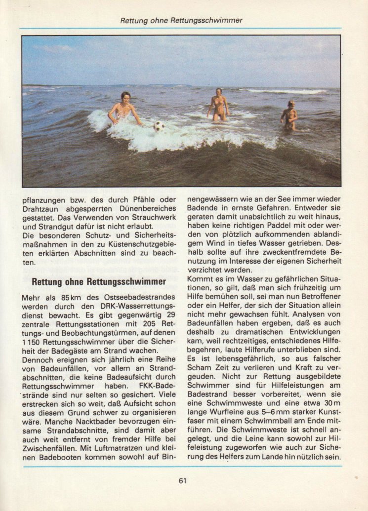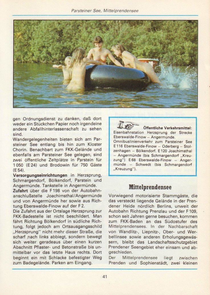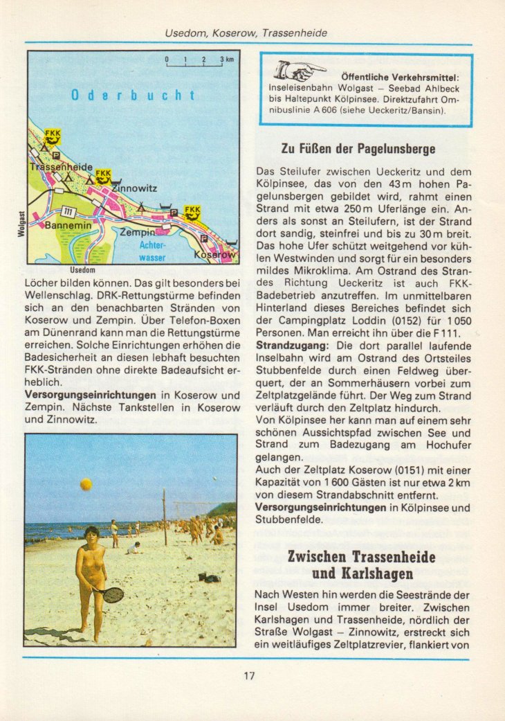 | Auflistung der FKK-Möglichkeiten zu Zeiten der ehemaligen DDR, jeweils mit kleinen Umgebungs- karten versehen, sowie einer Beschreibung, wie man die Plätze auch mit öffentlichen Verkehrsmitteln erreichen konnte.