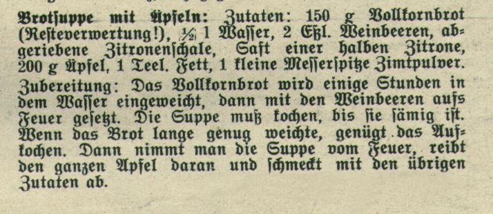 Zubereitung: Das Vollkornbrot wird einige Stunden in dem Wasser eingeweicht, dann mit den Weinbeeren aufs Feuer gesetzt. Die Suppe muß kochen, bis sie sämig ist. Wenn das Brot lange genug weichte, genügt das Aufkochen. Dann nimmt man die Suppe vom Feuer, reibt den ganzen Apfel daran und schmeckt mit den übrigen Zutaten ab. |