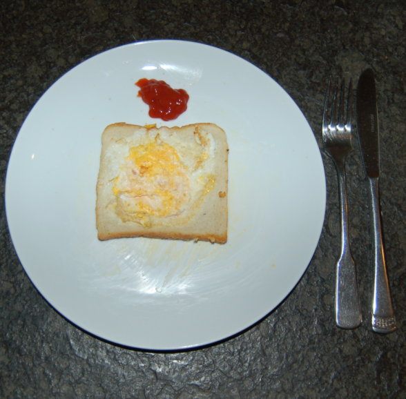 Zuerst wird in das Toastbrot ein Loch von ca. 4 bis 5 cm geschnitten und dieses dann ganz kurz von beiden Seiten in einer leicht gefetteten Pfanne angebraten. Dann ein rohes Ei aufschlagen und in das Loch der Toastscheibe geben. Durch Wenden beidseitig festbraten, etwas salzen - fertig !