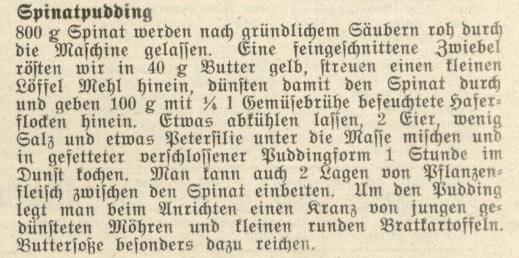 Zubereitung: 800 g Spinat werden nach gründlichem Säubern roh durch die Maschine gelassen. Eine fein geschnittene Zwiebel rösten wir in 40 g Butter gelb, streuen einen kleinen Löffel Mehl hinein, dünsten damit den Spinat durch und geben 100 g mit ¼ l Ge- müsebrühe befeuchtete Haferflocken hinein. Etwas abkühlen lassen, 2 Eier, wenig Salz und etwas Petersilie unter die Masse mischen und in gefetteter verschlossener Puddingform 1 Stunde im Dunst kochen.