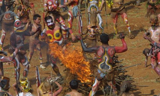 Zum Feuer-Festival werden traditionell in den Häusern alle „alten” Feuer gelöscht und die Feuerstellen gereinigt. Eine Aufgabe, die den Frauen und Mädchen zukommt. Unterdessen entfachen die Männer und die Jungen nach alten Methoden „neue” Feuer. Nebenbei gibt es noch eine große Feuerstelle, Mittelpunkt des Festes. Hier wird dann nicht nur gesungen und getanzt, sondern auch kleine Wettbewerbe veranstaltet. Alle männlichen Teilnehmer sind dabei mit großen Kreisen und Punkten bemalt - Muster als Verehrung der Natur. Die erwachsenen Männer tragen dabei einen kleinen Lendenschurz, die Jungen sind komplett nackt. Je nach Region werden Hüte oder Masken getragen.