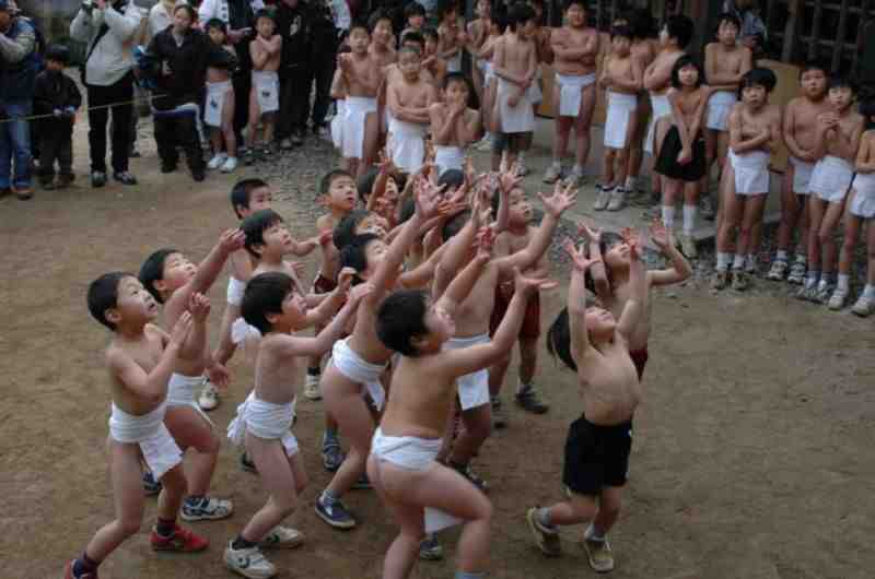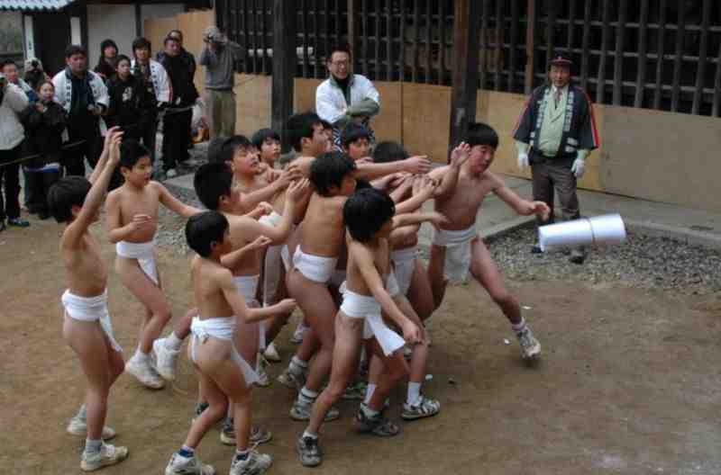 Bevor die erwachsenen Männer die Jagd nach dem Glück beginnen, sind die Kinder dran: das Hadaka Matsuri findet für die Schüler der Grundschule statt, welche ab 18:00 Uhr jeweils in kleinen Gruppen um Schatzsymbole spielen und kämpfen. Auch Mädchen machen mit, tragen ebenfalls - wie ihre Mitschüler - nur einen Lendenschurz, bzw. eine Turnhose.