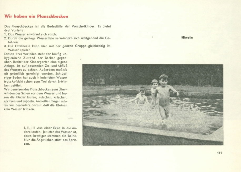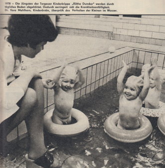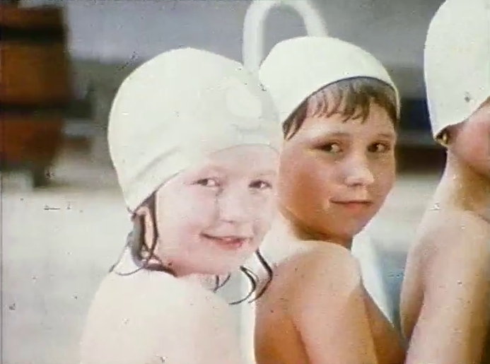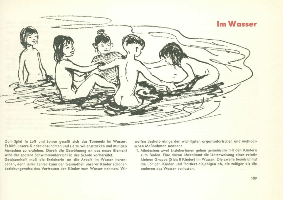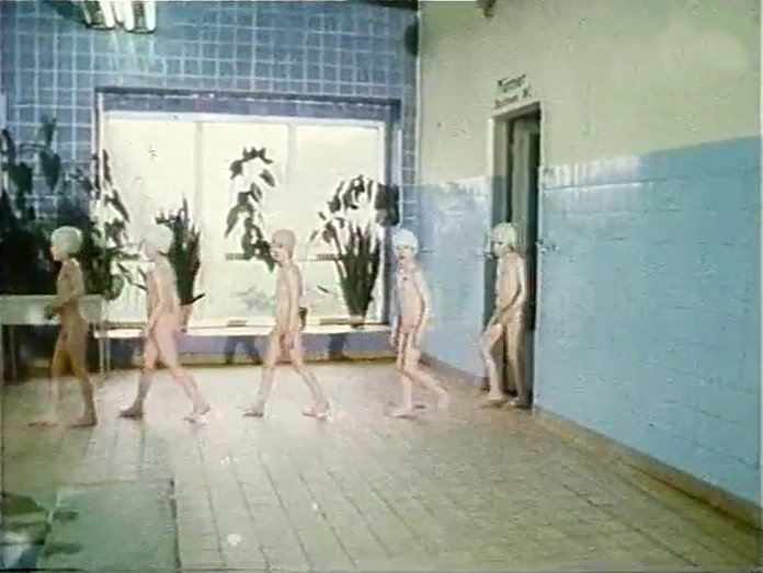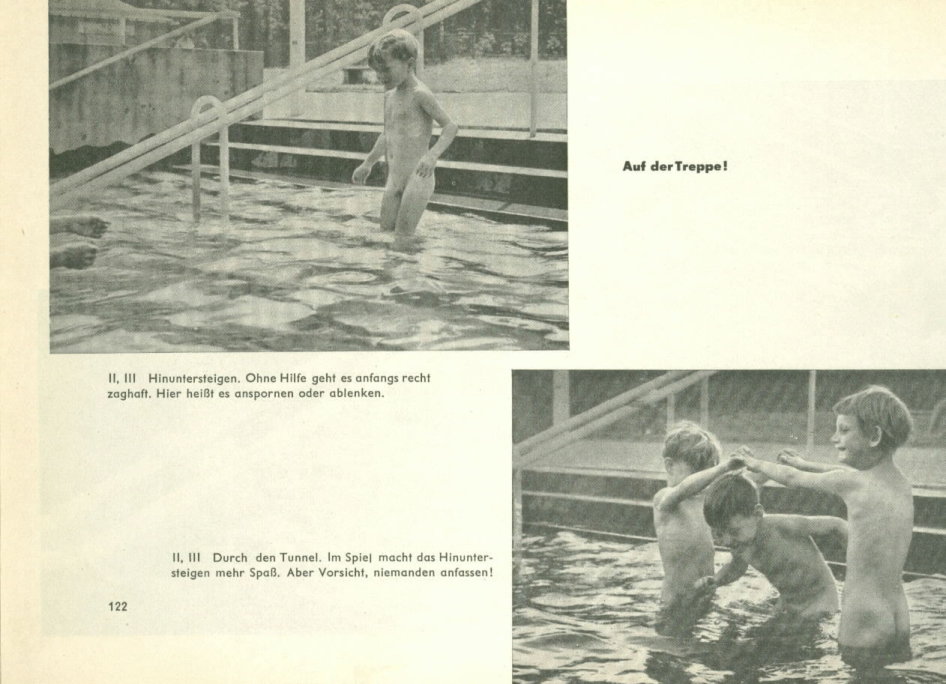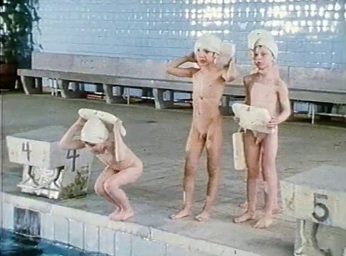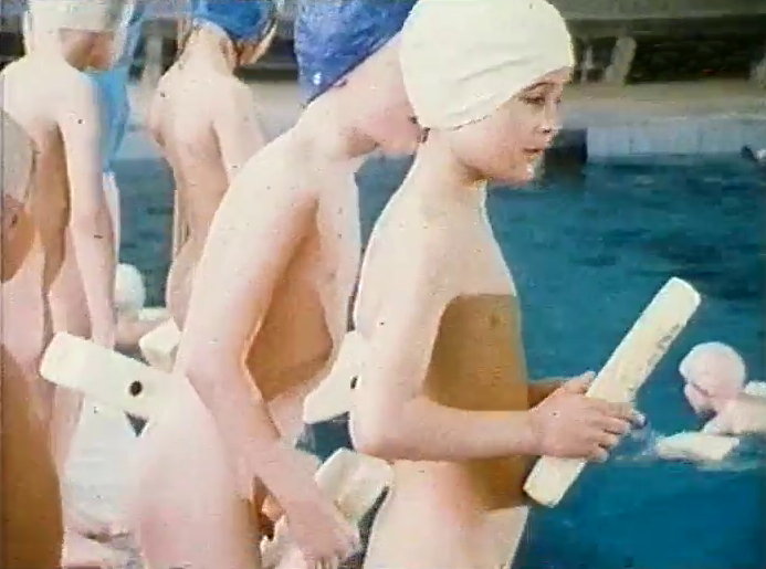 Der Off-Text der Sprecherin einer 30 Sekunden langen DEFA-Reportage (1986) über die Unterstufenkinder einer POS im Bezirk Halle lautet: »In Weißenfels lernen Siebenjährige Schwimmen – ohne Badeanzug. Für sie ist das kein Ereignis, keine Sensation. Eltern, die dagegen etwas einzuwenden haben, sollten Folgendes bedenken: Prüderie in der Erziehung kann die Kinder später in Konflikte bringen: Es ist nämlich erwiesen, dass die hohe Scheidungsrate, vor allem junger Ehen, ihre Ursachen auch in falscher und mangelhafter Sexualerziehung hat. Und wer möchte sie ihnen nicht ersparen, solche bitteren Erfahrungen.« – Irritierend dabei ist, dass die in dem Beitrag gezeigten Jungen ihre Nacktheit zu ignorieren scheinen und unbefangen vor der Kamera agieren, beispielsweise beim Marsch in einer Reihe aus der Gruppenumkleide in die Schwimmhalle, während alle Mädchen – entgegen der Behauptung im Off-Text, diese Form des Schwimmunterrichts sei »kein Ereignis, keine Sensation« – ihre Geschlechtsteile mit den Händen verdecken, sich mit dem Rücken zur Kamera drehen, sobald diese auf sie schwenkt, oder sich so eng hintereinander an das Schwimmbecken stellen, dass jeweils die Körperfront durch eine Mitschülerin und/oder vorgehaltene Schwimmhanteln aus weißem Hartschaumstoff verdeckt wird. Es ist offensichtlich, dass sich die Mädchen in den gezeigten Situationen des Schwimmunterrichts ohne Badebekleidung, zumindest in Anwesenheit einer Fernsehkamera und eines Filmteams, unwohl fühlen.