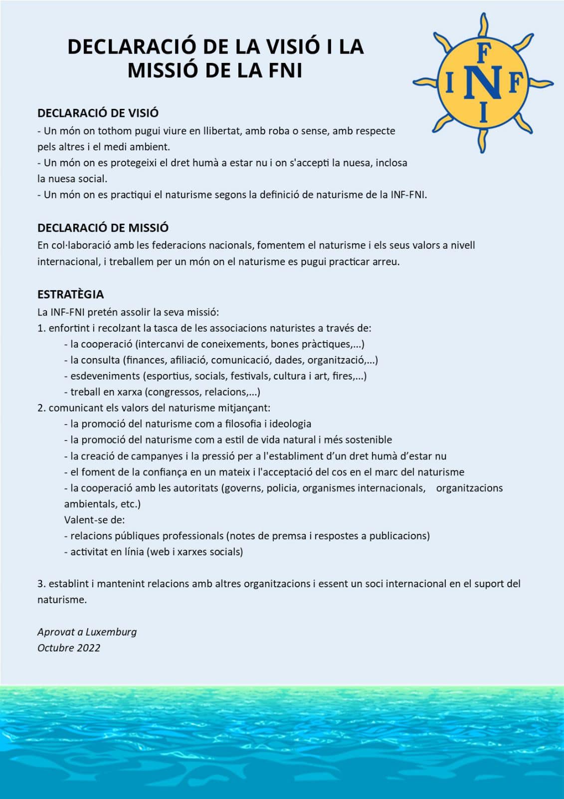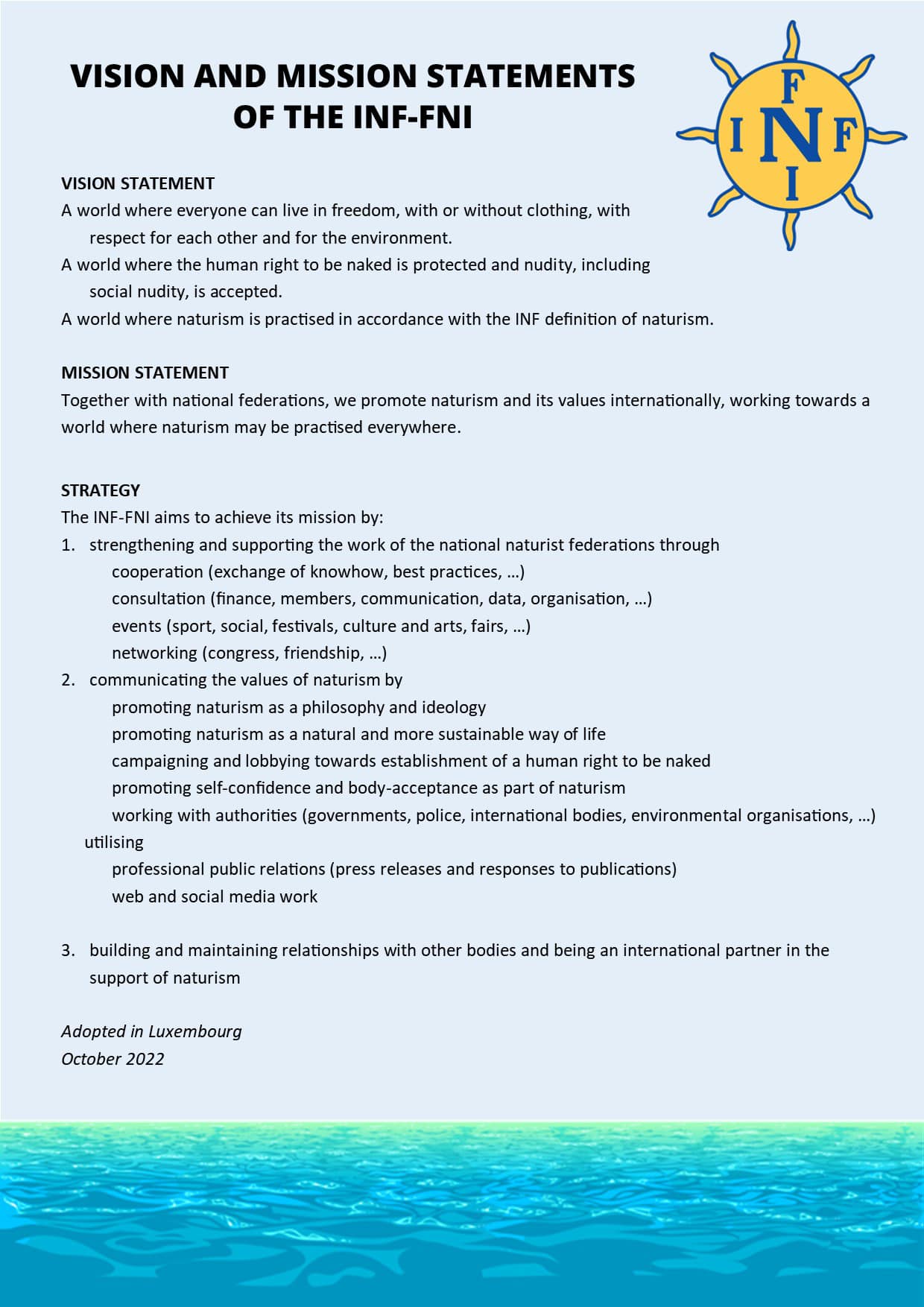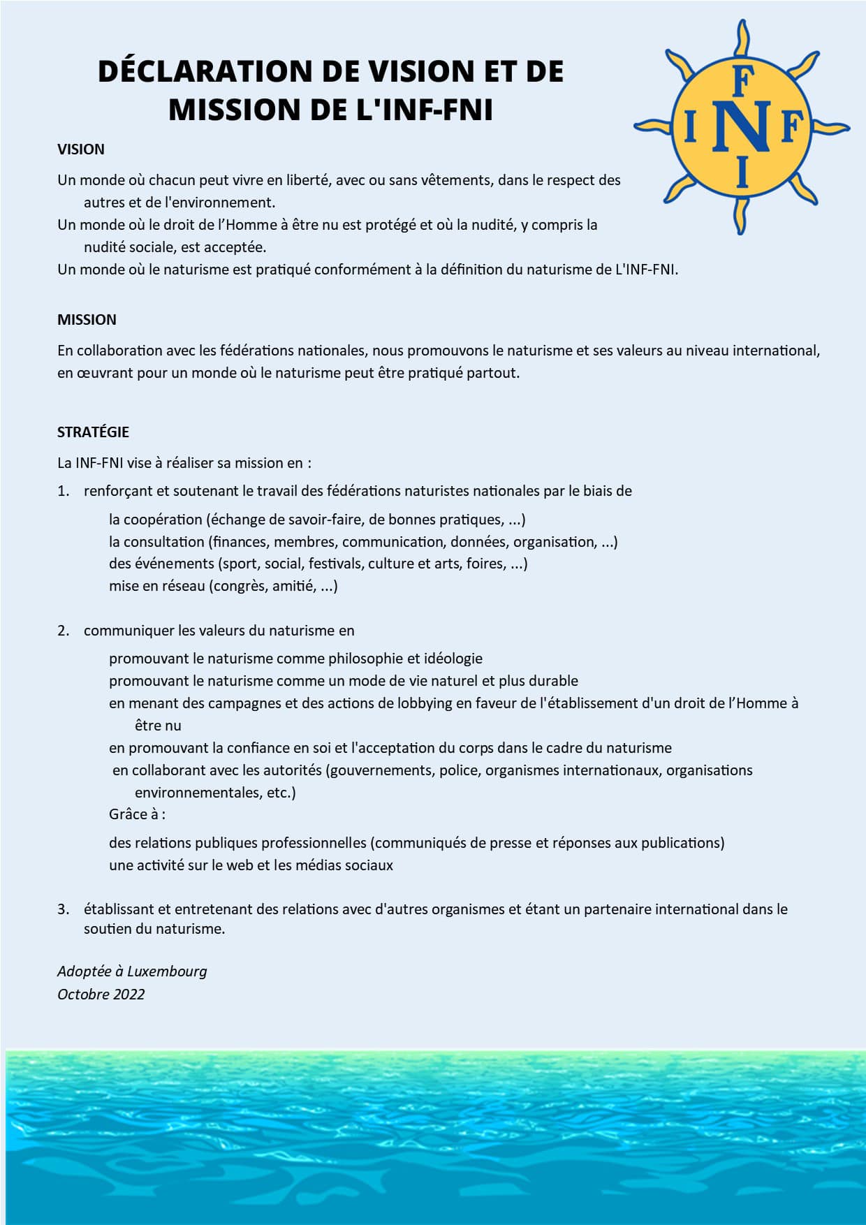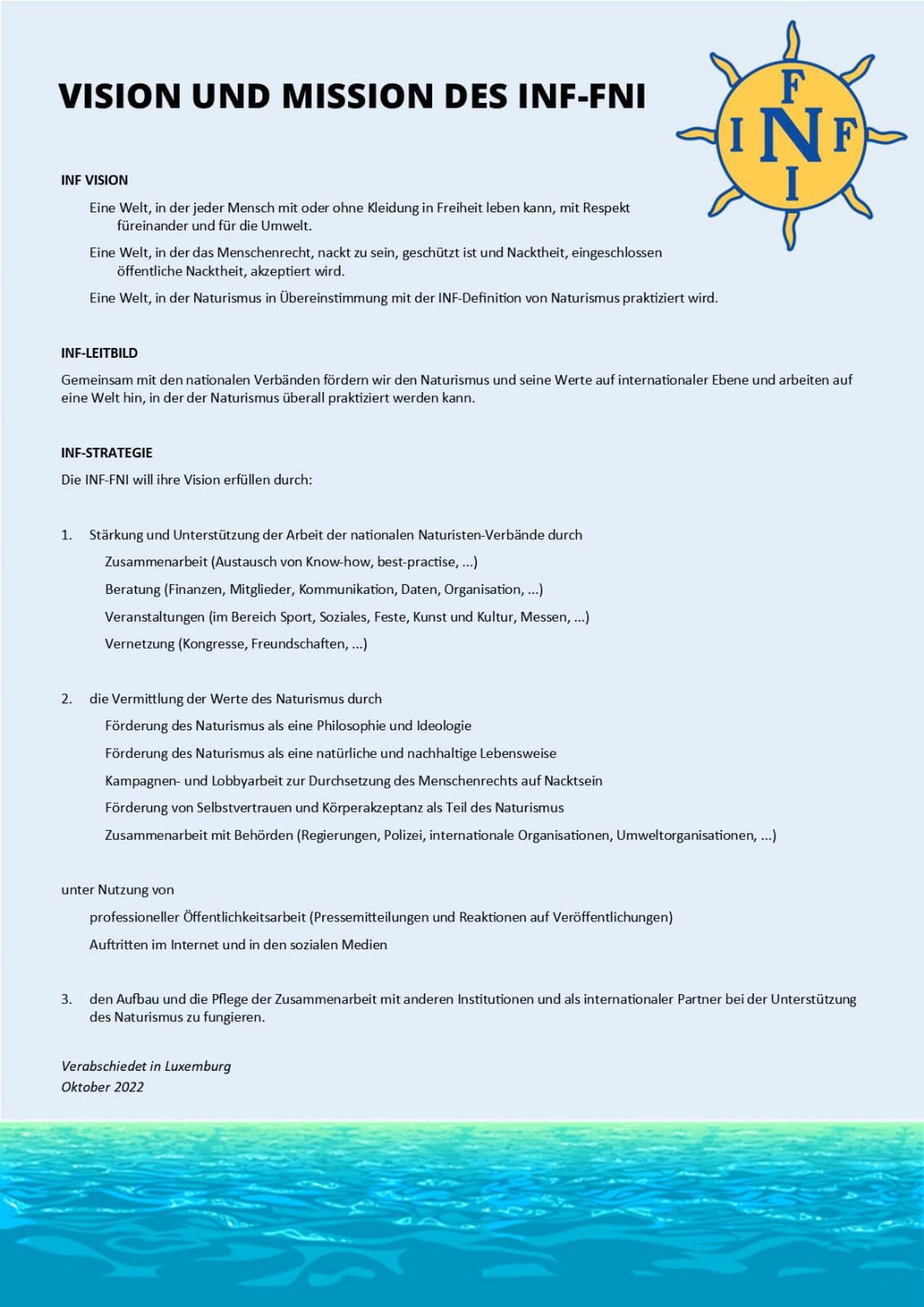 Den von INF-FNI und FLN organisierte INF-FNI-Weltkongress 2022 fand vom 20. bis 23. Oktober 2022 in Luxemburg statt. Unter anderem wurden unter dem Titel „Vision und Mission des INF-FNI” das Leitbild, die Vision und die dazu gehörige Strategie verabschiedet: