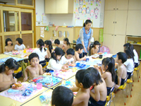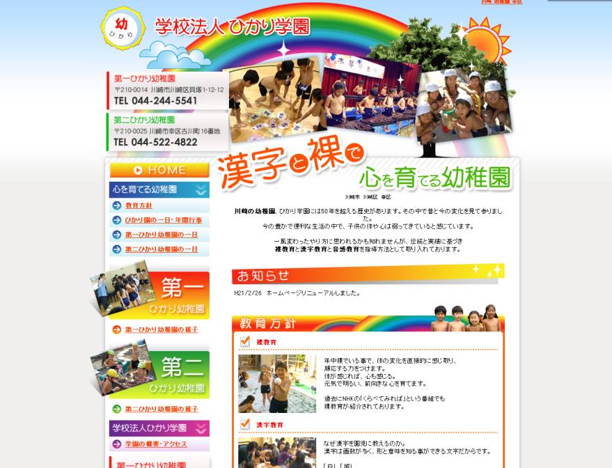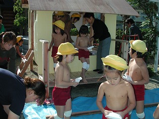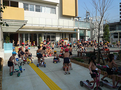 Als Beispiel dient der »Hikari«-Kindergarten in Kawasaki (Kanagawa, Japan), wo es gleich mehrere Einrichtungen dieser Art gibt. Dieser Kindergarten (mit Vorschul-Erziehung) besteht seit 1953. Anfänglich waren die Kinder dabei ganz nackt, inzwischen (nur) noch »oben-ohne« - Jungen, wie auch Mädchen.