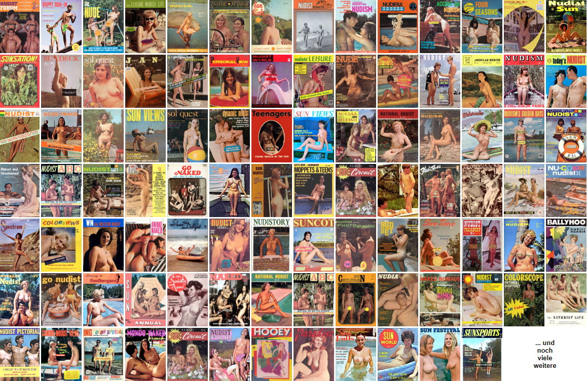 ➽ EXPOSURE and DESIGN ➽ Dynamic Nudist ➽ Glen Eden ➽ Golden Days ➽ Harmony ➽ Journal of American Nudism ➽ Naked Living ➽ National Nudist ➽ Nude World ➽ Paradise ➽ Sun Fun ➽ Sun Lore ➽ Sunscope ➽ Suntan ➽ Suntrails ➽ TEENAGERS ➽ Utopia ➽ Weitere Hefte: Info !