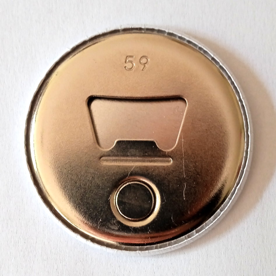 Magnet-Button — „Kühlschrank”-Magnet Praktischer Magnet-Button, ein Werbegeschenk der fkk-jugend e.V., mit einem Flaschenöffner (Kapselheber) auf der Rückseite.