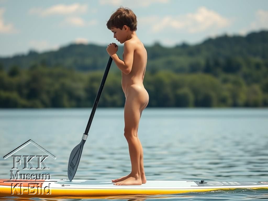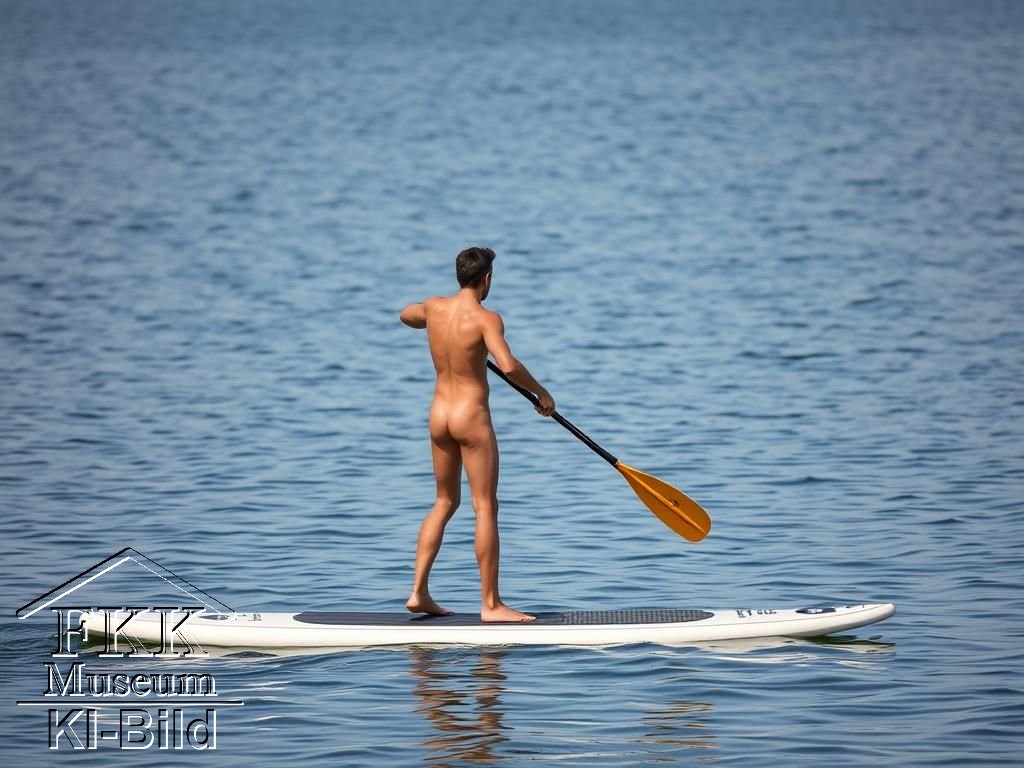 | Dank der Möglichkeit mit Hilfe der Künstlichen Intelligenz Bilder selbst zu generieren, sind wir nun in der Lage, auch diese Sport-Idee zu visualisieren und damit erfassbarer zu machen. Wir verfügen zwar über FKK-Fotos vom Stand-up-Paddling mit realen Menschen, haben aber keine Genehmigung zur Veröffentlichung. Auf Prompts zum generieren von Geschlechtsteilen haben wir verzichtet. |