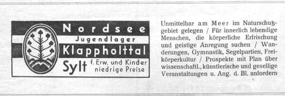 Wenn man oben auf der Düne steht, schweift der Blick im Osten über das Wattenmeer bis zur schattenhaft geahnten dänischen Küste hinüber, während er sich nach Westen verliert über der Unendlichkeit der freien Nordsee. Keinen schöneren Ort könnte es für den Natrufreund geben, der für ein paar Wochen der Auffrischung seines Körpers, seines Gemüts nachgeht. Mit seinem weißen kilometerweiten Strand, mit den gut aufgezogenen kostenlosen Gymnastikkursen, mit seiner ausgezeichneten Verpflegung bietet Klappholttal während der hochsommerlichen Gästezeit regelmäßig einem runden Tausend von Besuchern das Glück einer vollkommenen Erholung.