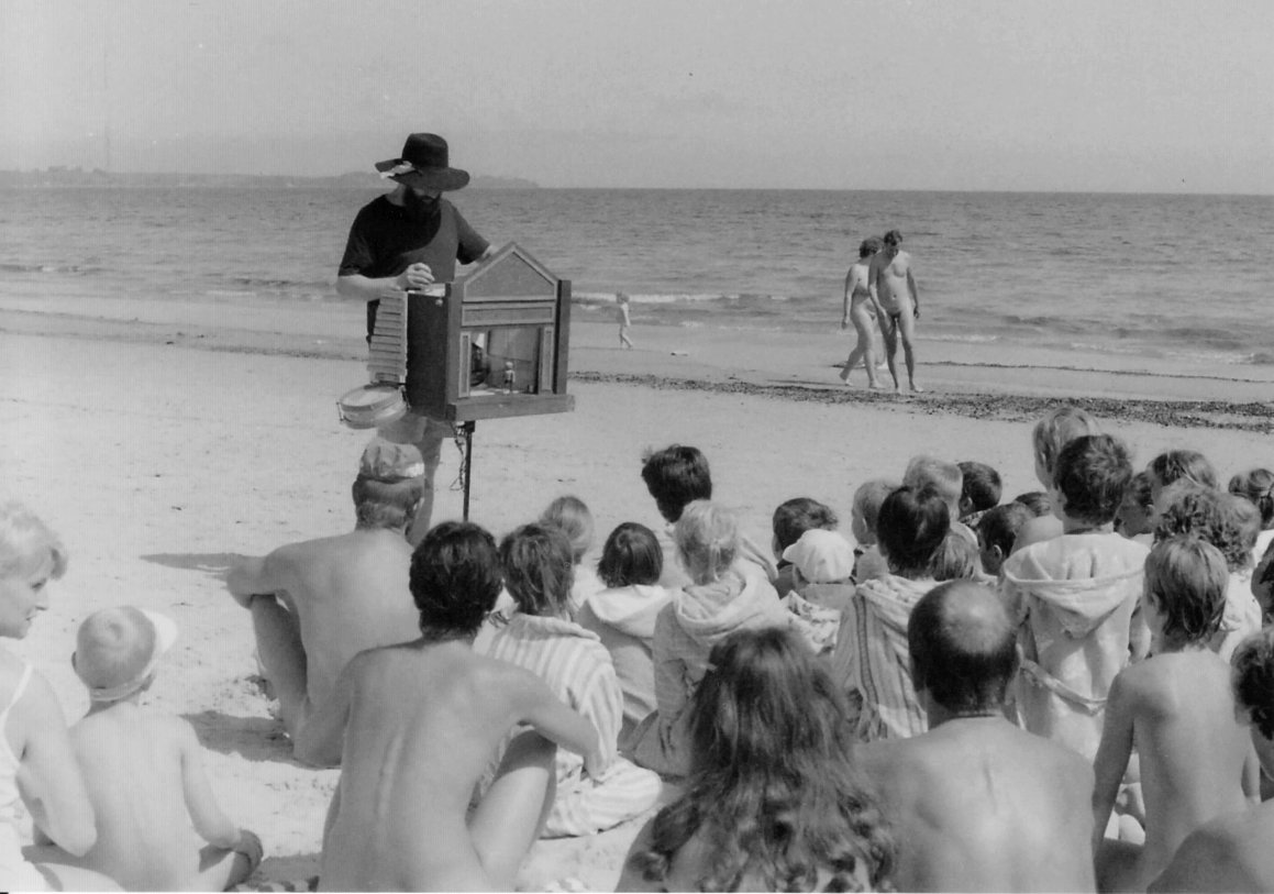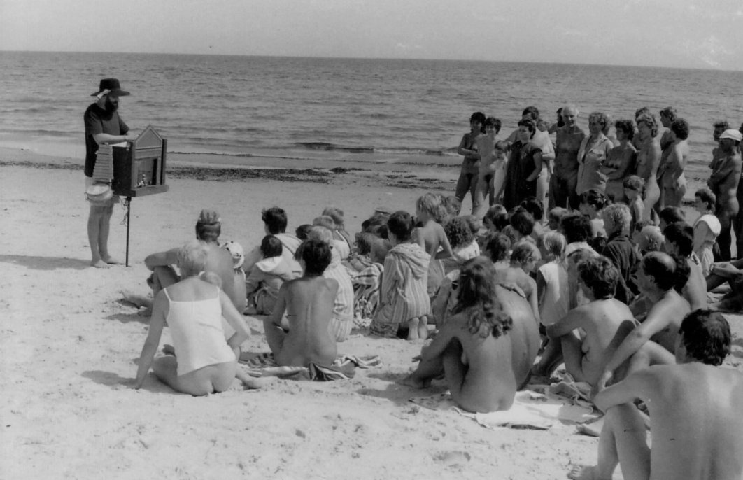 Urheber dieser Bilder, Herr R. Nitkowski, gab dem FKK-Museum die Genehmigung der Veröffentlichung dieser interessanten FKK-Bilder. Die Aufnahmen von dem Kasperle-Theater stammen aus dem Sommer 1989 am Ostseestrand Schaabe aufgenommen, von Glowe aus gesehen, zwischen dem 3. und 4. Parkplatz.