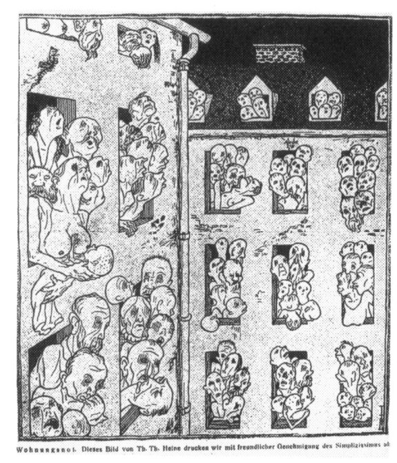 Die Industrialisierung brachte aber nicht nur eine aufsteigende bürgerliche Klasse hervor, mit ihr begannen auch die Verstädterung und die Urbanisierung. Die Arbeit auf dem Lande war gegenüber den grossen Fabriken in den Städten nicht mehr konkurrenzfähig, weshalb viele ehemalige Händler, Bauern und Handwerker gezwungen waren, in die Städte zu ziehen. Entsprechend wurde zentrumsnahe Wohnfläche immer gefragter und die kleinen, dunkeln und feuchten Mietkasernen für die Arbeitergesellschaft immer teurer.