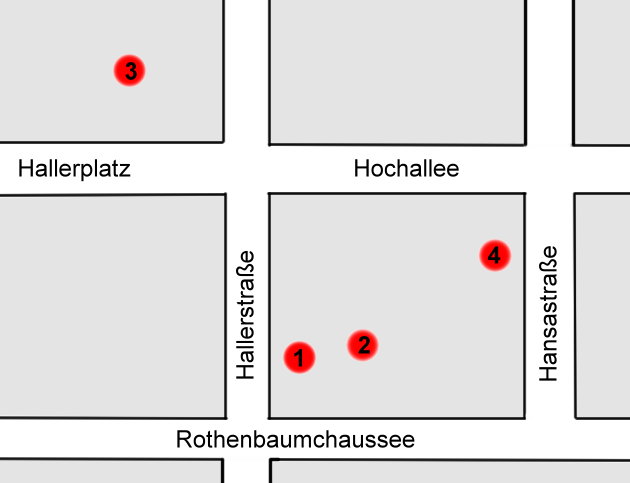 Eine etwas „härter” Version des Flaschendrehens hatten wir dann bei Thomas (4) gemacht: wer verlor und bereits nackt war, der musste auf dem Fahrrad um den Block, um den ganzen Block, fahren: Hansastraße → Rothenbaumchaussee → Hallerstraße → Hochallee → Hansastraße !