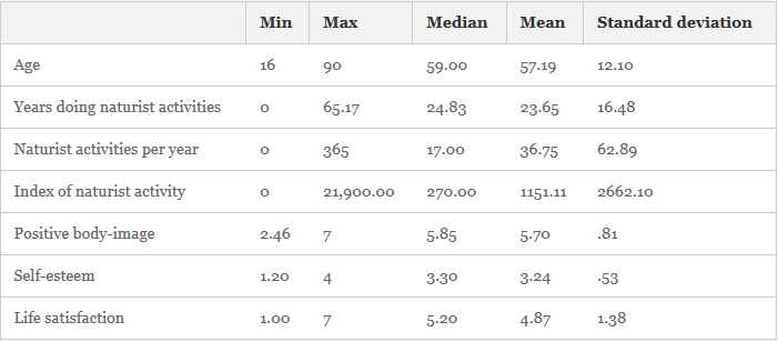 Overall, most participants (805 or 95%) indicated that they had taken part in naturist activity at least once in their lives; participants also indicated that they took part in a mean of 36.75 naturist events per year. However, this number may be misleadingly high. Fifty per cent of participants took part in 17 or fewer naturist activities per year, suggesting that these participants were not ardent naturists, but rather people who would occasionally take part in clothing-optional activities. Furthermore, the phrasing of the question, which asked participants whether they had ever “been fully or partially undressed outdoors and/or in the company of other people (other than [their] close family or romantic partner)”, was very inclusive, and may have increased the number of positive responses. For example, each topless trip to a beach would count as a separate activity. For those who had spent time taking part in naturist activities, overall they indicated that they started taking part a mean of 23.65 years ago, a value close to the median (24.83).