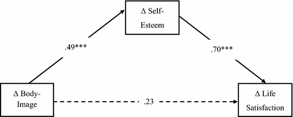 Relationship between changes in body image and changes in life satisfaction, mediated by changes in self-esteem in Study 3. Note *p < .05, **p < .01, ***p < .001