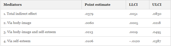 The hypothesised mediated relationships were supported by the data; see Fig. 1. Naturist activity predicted more positive body image (b = .08, p = .03), which in turn predicted higher self-esteem (b = .50, p < .0001 ), and greater life satisfaction (b = .08, p = .01). Higher self-esteem also predicted greater life satisfaction (b = .56, p < .0001). The total indirect effect of naturist activity on life satisfaction was positive and significant; LLCI = .0051, ULCI = .083, point estimate = .038. All other indirect effects of naturist activity on life satisfaction can be seen in Table 3. This model accounted for 37% of the variance in participants’ life satisfaction scores.