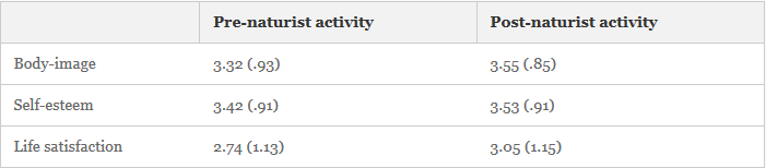 Descriptive statistics are reported in Table 4. Neither age nor gender predicted any of the dependent variables (.08 < all p’s < .99). Differences between pre-event and post-event scores were investigated using a repeated-measures multivariate analysis of variance with time (pre-naturist activity vs. post-naturist activity) as the independent variable and body-image, self-esteem and life satisfaction as dependent variables. This analysis is more conservative than using multiple paired-samples t tests, which would not account for covariance between the dependent variables.