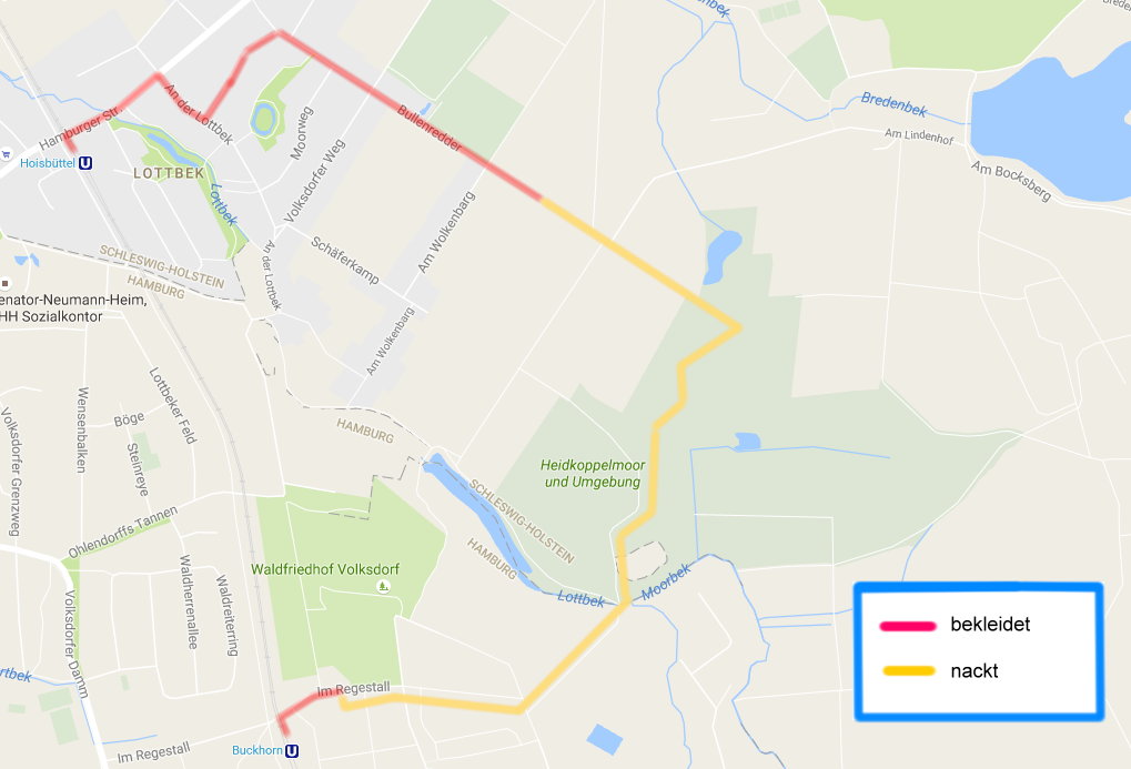 Einige hundert Meter weiter, in Höhe von dem Waldrestaurant (beim Waldfriedhof Volksdorf) habe ich mich dann wieder angezogen - leider - und bin dann die restlichen Meter zur U-Bahn-Station „Buckhorn” wieder in Klamotten gelaufen. Für die Strecke, für die man sonst nur eine ¾ Stunde bräuchte, wie am Anfang erwähnt, habe ich mit meinen kleinen Pausen gut 2 Stunden gebraucht, wovon ich jede Minuten genossen habe.
