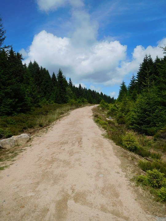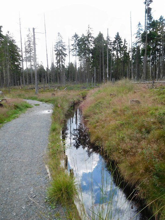Dem Graben sind wir dann eine Weile gefolgt. Anschließend hielten wir uns leicht links, um dem Goetheweg ein Stück zu folgen. Dann hielten wir uns aber für ca. 2,7 Kilometer rechts um über den Kaiserweg zum „Dreieckigen Pfahl” zu gelangen. Auf dem Weg dort hin kamen wir an einer Schutzhütte und einem traumhaft schönen Biotop vorbei. Dazwischen sind wir einem beeindruckenden Trail über Stock und Stein gefolgt. Zwischendurch blieben wir ein paar mal stehen, um die leckeren Blaubeeren zu naschen.