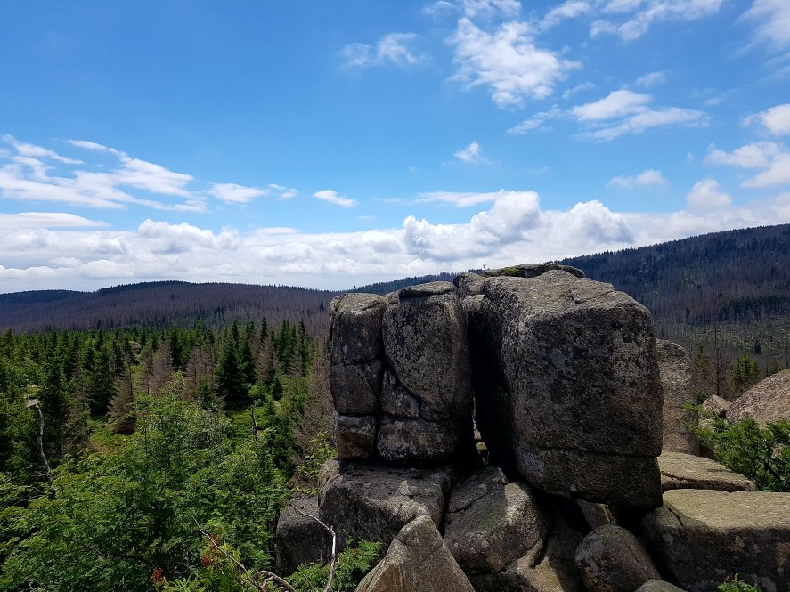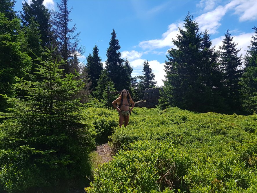 Ich hielt mich also links und bin einem schmalen und von großen Felsen übersäten Pfad gefolgt. Dort sind Unmengen an Blaubeerbüschen, die aber jetzt leider noch keine Früchte tragen. Dieser Pfad führt direkt zu den Klippen der sogenannten „Brockenkinder” - eine traumhaft schöne Gegend.