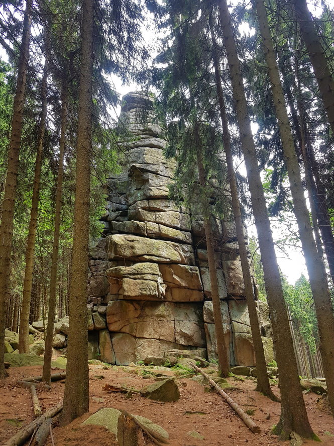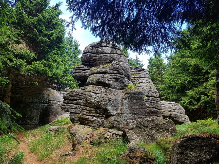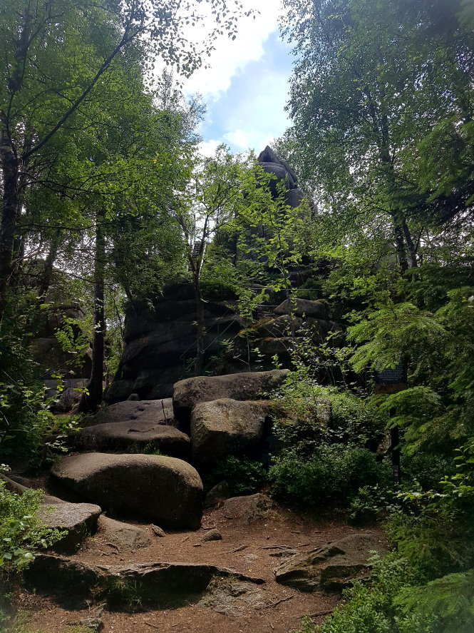 Dort führt eine Stahlleiter rauf auf die Klippe. Man hat da eine klasse Aussicht in alle Himmelsrichtungen. Und es war sehr windig da oben. Nachdem ich noch ein paar Fotos gemacht hatte, ging ich den Pfad wieder zurück bis zu den bereits erwähnten Brockenkindern. Dort hielt ich mich links und bin auch dort einem schmalen Waldpfad gefolgt, der mit Wurzeln und Felsen übersät ist.