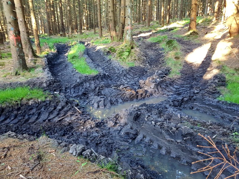 Nach wenigen Minuten musste ich mit Entsetzen feststellen, dass der Waldweg durch die schweren Maschinen der Forstarbeiter völlig zerstört wurde.