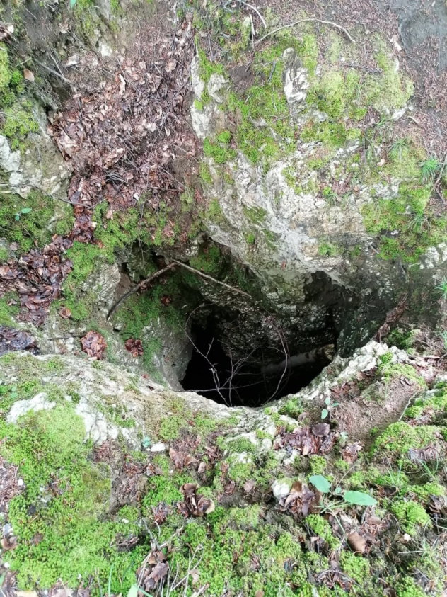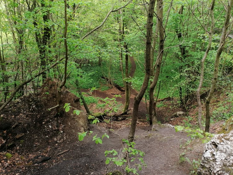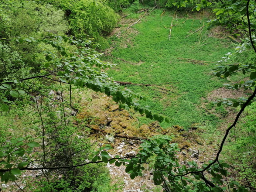 Als ich weiter gegangen bin, kam ich zum „Hirschzungen-Erdfall”, der war noch beeindruckender als der vorherige war. Dort traf ich auf eine kleine Gruppe Frauen die ebenfalls das schöne Wetter genutzt haben. Nach einer kurzen und netten Unterhaltung ging ich weiter meines Weges. Kurze Zeit später traf ich auf einen weiteren Erdfall, an dessen Rand die eingestürzten Reste einer kleinen Höhle zu sehen waren.