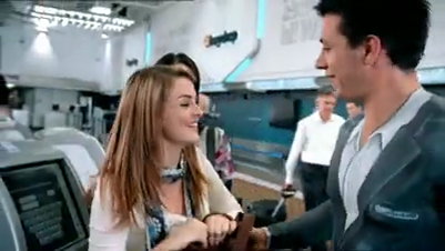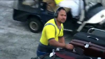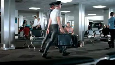 Crew und Bodenpersonal der Fluglinie sind auf dem ersten Blick angezogen ... erst, wenn man genauer hinsieht, lässt sich erkennen, dass die ganzen Uniformen nur aufgemalt, das Personal ansonsten nackt ist.