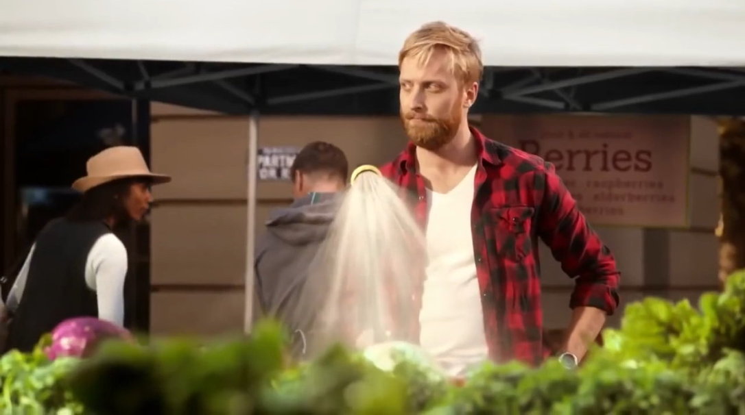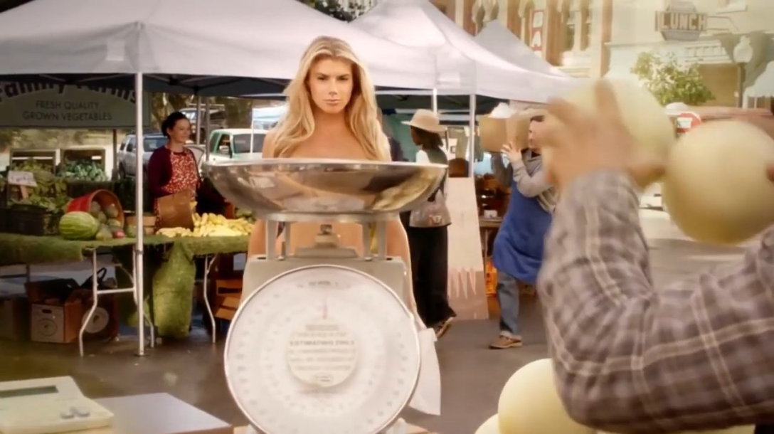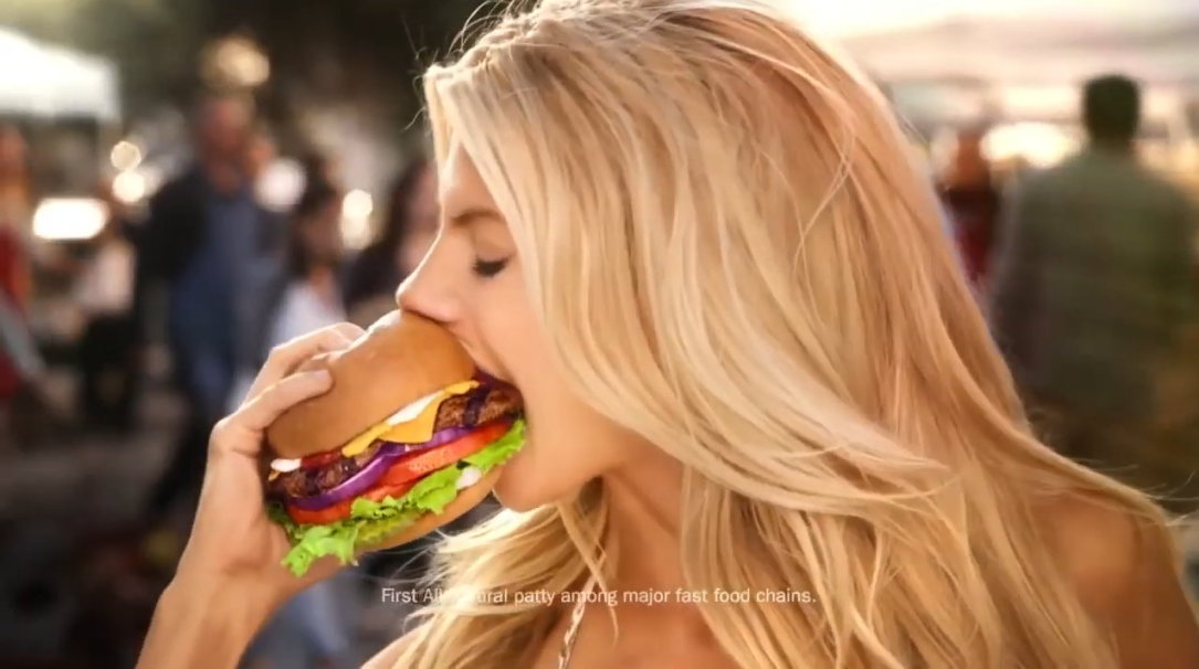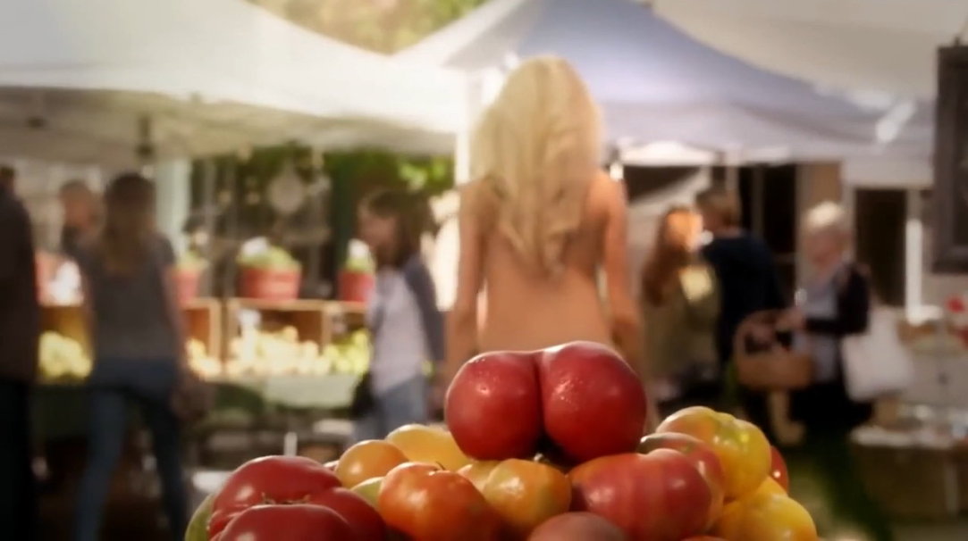 In dem Werbespot aus dem Jahr 2022 ist eine junge Frau zu sehen, wie sie nackt über einen Frische-Markt schlendert und zum Schluß in einen „All-Natural Burger” beißt.