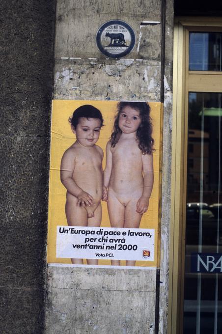 Wahlplakat der PCI (Partito Comunista Italiano), einer kommunistischen Partei aus dem Jahr 1984. Dieses Bild mit den beiden kleinen nackten Kindern gab es als Plakat und ganzseitigen Anzeigen in Zeitschriften.