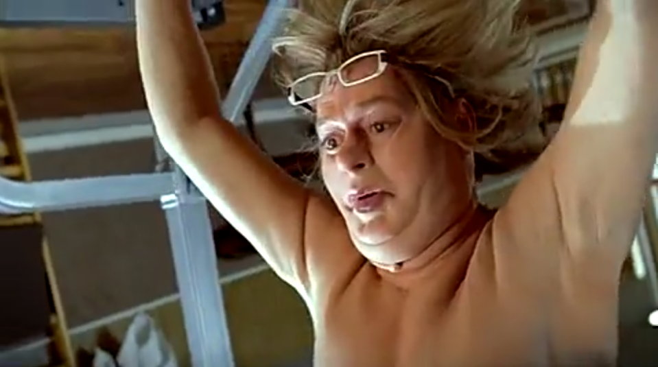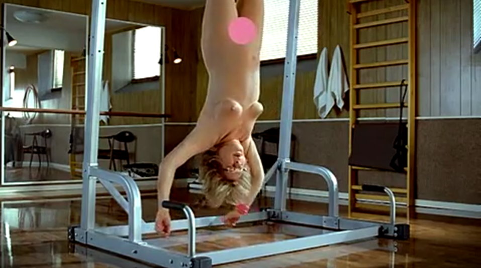 In diesem Werbespot aus den späten 1990er Jahren sieht man eine etwas ältere Dame, wie sie nackt ein paar gymnastische Übungen an einem Turngerät absolviert.