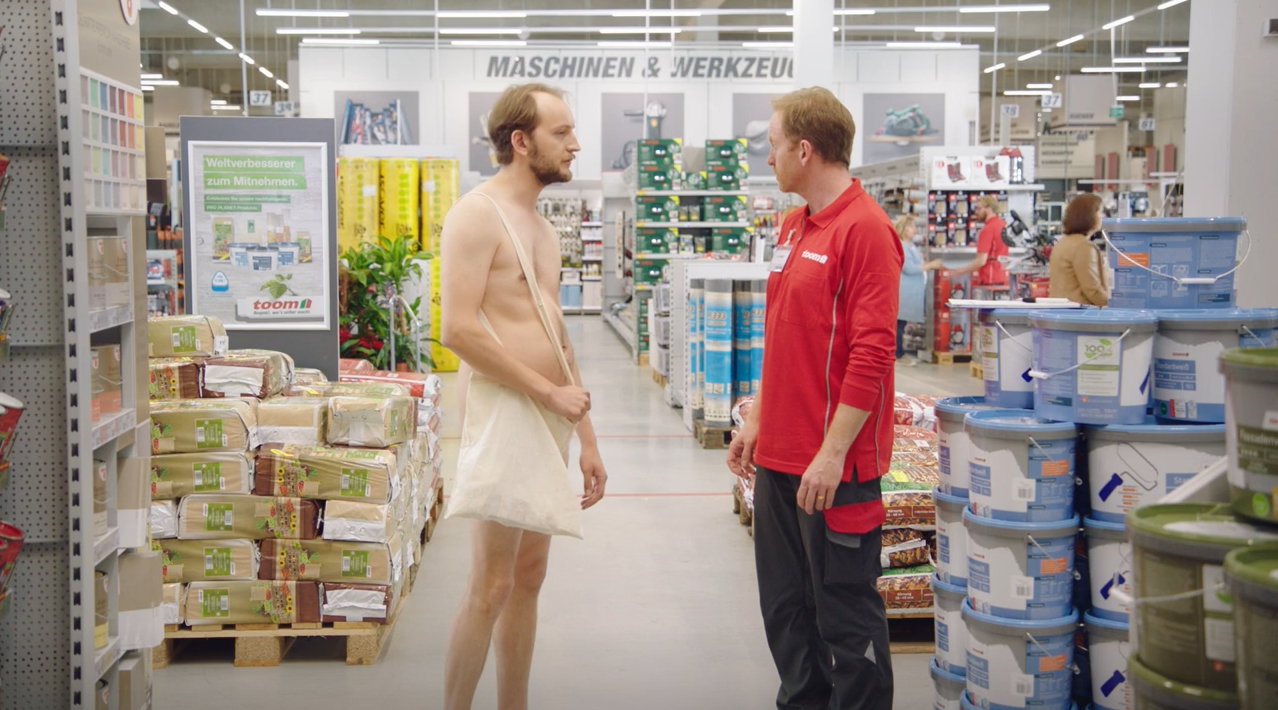 Der nackte Mann, ein Naturschützer, ist auf der Suche nach einer stabilen Kette, um sich an einen Baum zu fesseln, damit dieser nicht gefällt werden kann. Stattdessen empfiehlt ihm der Toom-Mitarbeiter umweltfreundliche, torffreie Erde, um selber Bäume pflanzen zu können.
