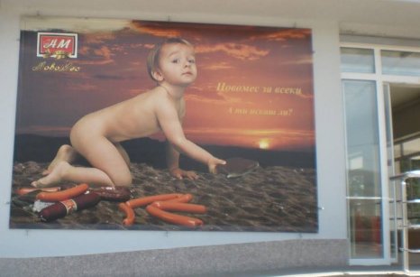 Werbeplakat der im Jahre 2001 gegründeten Fleischwarenfabrik Новомес (→ Novomes) aus dem Ort Nowo-Selo. Das auf dem Plakat abgebildete Kind ist der fünfjährige Sohn der Inhaberin.