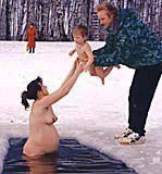 Viele Leute taufen im Eisloch auch in der Nacht, mit dem Anfang des Feiertages. Man muss mit dem Kopf ganz ins Wasser eintauchen. Diese Zeremonie erfolgt aber auch am Tag, neben der Kirche, in Anwesenheit eines Priesters. Die Badenden, bzw. die zu Taufenden sind bei dieser Zeremonie nicht immer nackt. Getauft werden nicht nur junge Leute, sondern auch alte Leute, Kinder und sogar Babies. Dieser Vorgang sieht zwar „schrecklich” aus, ist aber recht kurz und schnell vorbei.